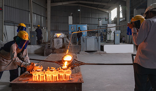 Pouring — The mold is preheated in a furnace to approximately 1000°C (1832°F), and the molten metal is poured with approximately 1500°C to 1600°C, depending on the metal, from a ladle into the gating system of the mold, filling the mold cavity.